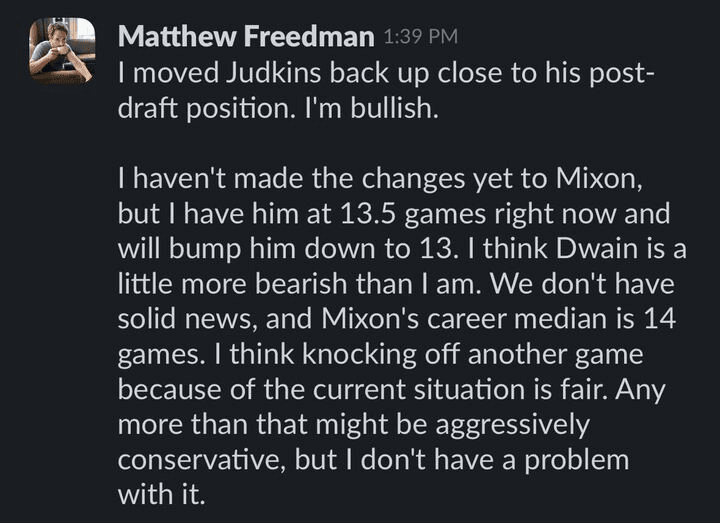 Joe Mixon has yet to practice after reports of him in a walking boot surfaced in the summer. The lack of insight has folks pulling him from their boards. Meanwhile, Dwain and Freedman have been practicing alchemy to weave the news into our projections.