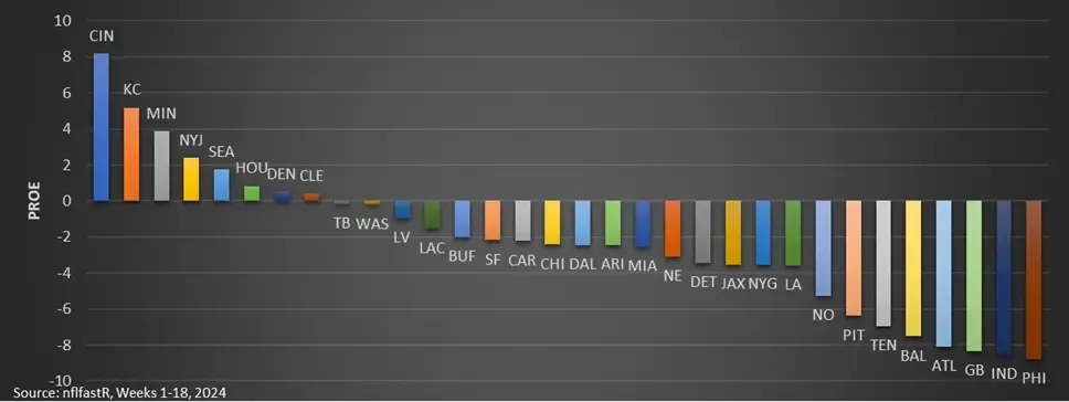 However, using last year's results to project the next can be disastrous. I discussed this when digging into the Cowboys’ EPA per play without Dak Prescott. We should expect an improvement in ’25 with Prescott healthy. A similar concept applies to PROE.