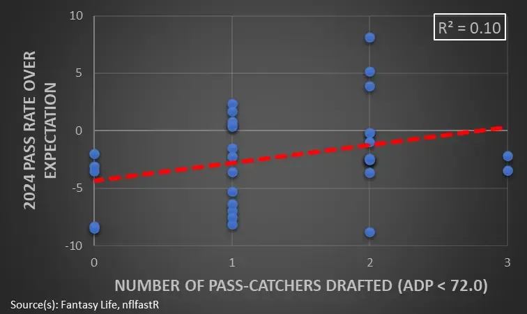 Knowing each team’s PROE gives us a top-down view of their offense. Based on the last chart, we can jump from PROE to passing yards and, subsequently, the players likely on the other end of the throw. Drafters have already caught onto this idea based on early-round ADPs.