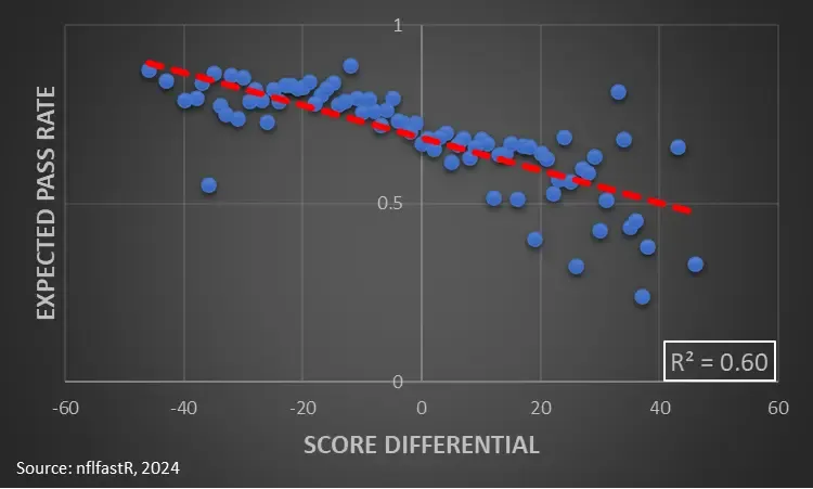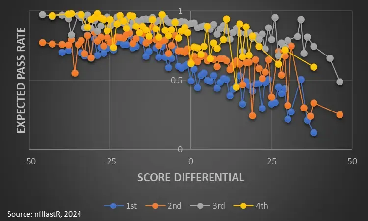Surprise! We’ve got another “x over expected” stat. However, in this case, we’re looking at when we should anticipate a team throwing the ball. Intuitively, whether or not they’re controlling or trailing in a game might influence their decision. Data from 2024 bears out this idea. As an offense increases its lead, the expected pass rate (xPR) decreases. The tropes of “bleeding the clock” and “slowing the game down” have been reshaped into stats. And we can layer in other critical components to a play to more accurately define our predictions.