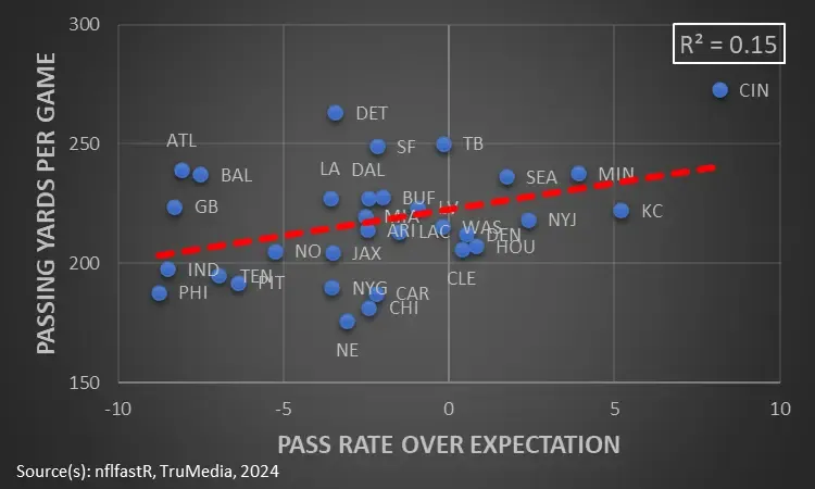 In either case, we know those teams won’t drastically change in 2025. But let’s use the idea of a QB’s preferences driving PROE to find an offense on the upswing. With that perspective in mind, Trevor Lawrence sticks out.