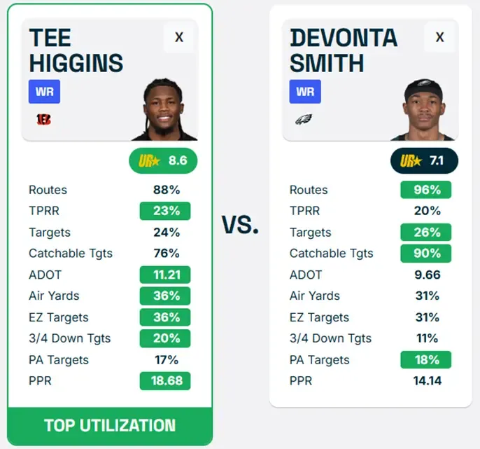 However, the Bengals’ WR2 averaged nearly three more targets per game than Smith (9.1 vs. 6.9). And critically, we know Burrow’s penchant for continuing to throw in the red zone. While Smitty watches yet another Tush Push from the sideline, Higgins gets six points, highlighting the importance of understanding PROE as a tiebreaker.