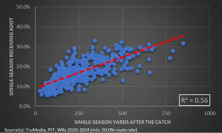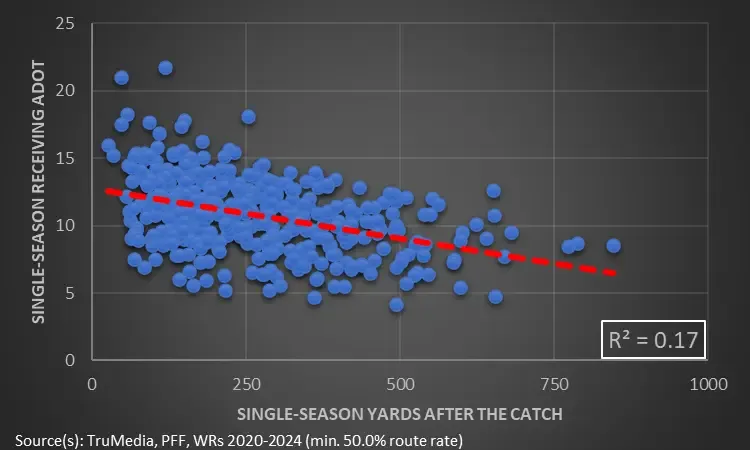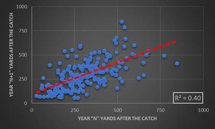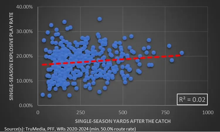 Explosives come in many forms. They could be a shot down the sideline or a short dart with good blocks out in front. Besides, not all post-catch forward progress is a series converter. Sometimes, a (much-needed) yard or two is good enough. So, YAC isn’t an indicator of big plays. But it can help us find future value.