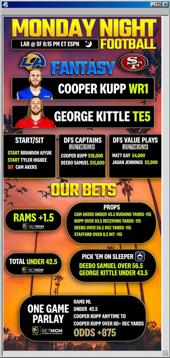The Rams have basically zero playmakers outside Cooper Kupp, while the Niners are still re-adjusting to getting back together with their ex, Jimmy Garoppolo.