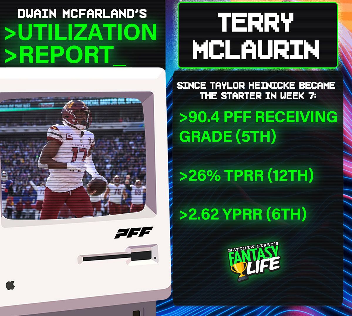 Since Taylor Heinicke took over at QB in Week 7, McLaurinās average target share is a heart-throbbing 31%, with four top-18 finishes and five top-30 outings.