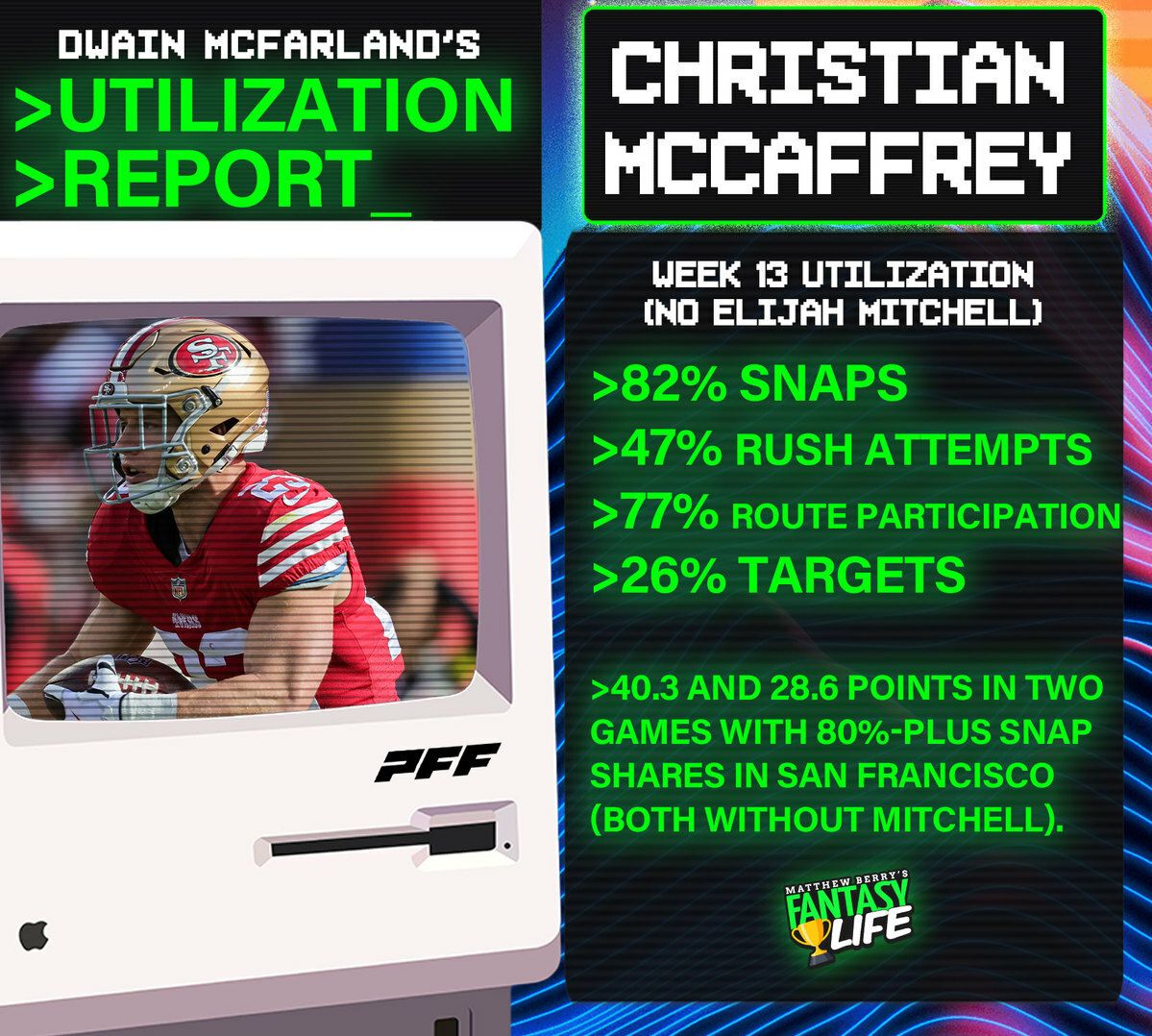 McCaffreyās utilization plummeted after the return of Elijah Mitchell, averaging only 32% (10.6) of the teamās rushing attempts over three games. However, with Mitchell on IR in Week 13, we saw CMC return to the type of dominance that makes him a top-three RB lock.