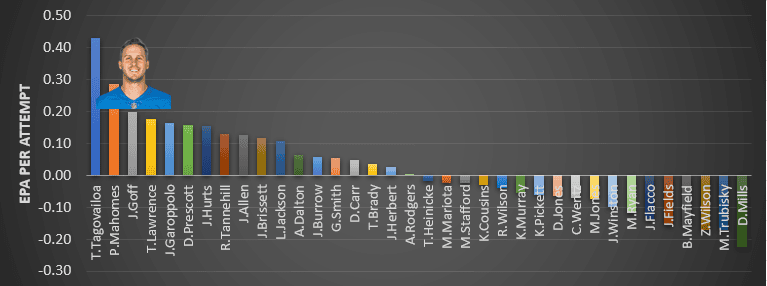 In Weeks 4-7, Goffās -1.56 EPA per dropback under pressure was the worst mark of any passer in the league. Zach Wilson, Carson Wentz, and Bailey Zappe worked the pocket better under duress. But I chose this three-game sample for a reason. He didnāt have (the Sun) God on his side.