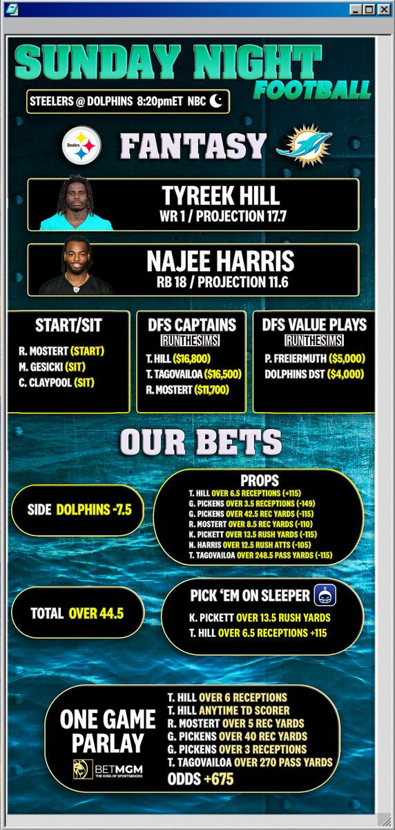 This SNF has some promise. The Dolphins are 7.5 point home favorites vs. the Steelers, but this is the first friendly matchup Kenny Pickett has faced since taking over at QB for Pittsburgh.