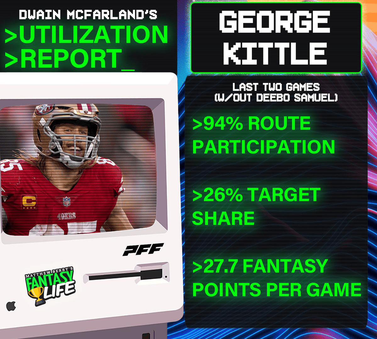 In the last two games without Deebo Samuel, Kittle has dominated with TE1 and TE3 finishes. He and Brandon Aiyuk are tied for the team lead with a 26% target share, and the explosive TE has 10 receptions on 11 targets for 213 yards and four TDs.