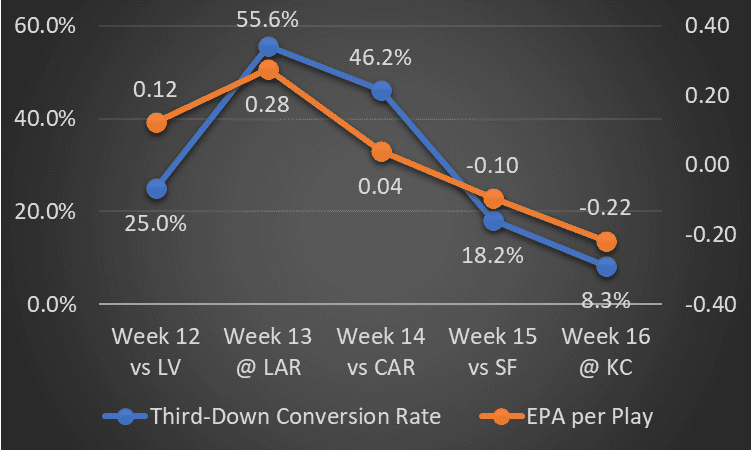 The third-year RB rarely plays on passing downs, and the trend continued in Week 16, with only 14% of the long-down and distance opportunities. However, his route participation eclipsed 60% in back-to-back games.Ā