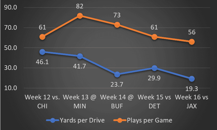 Additionally, we saw Jones deliver a season-low 26% route participation in Week 16 against the Dolphins. Dillon led the way in LDD situations (58%) and handled all three of the two-minute offense opportunities.