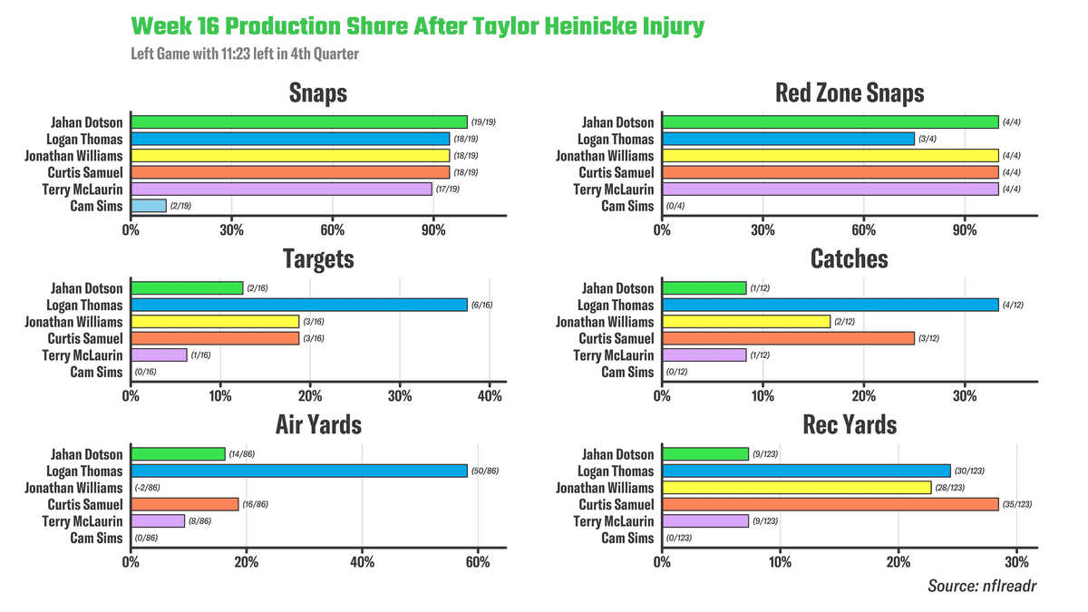 We only saw Carson Wentz for two drives at the end of the game, but an old trend immediately reared its ugly head ā McLaurin was only targeted one time on 16 passing attempts.