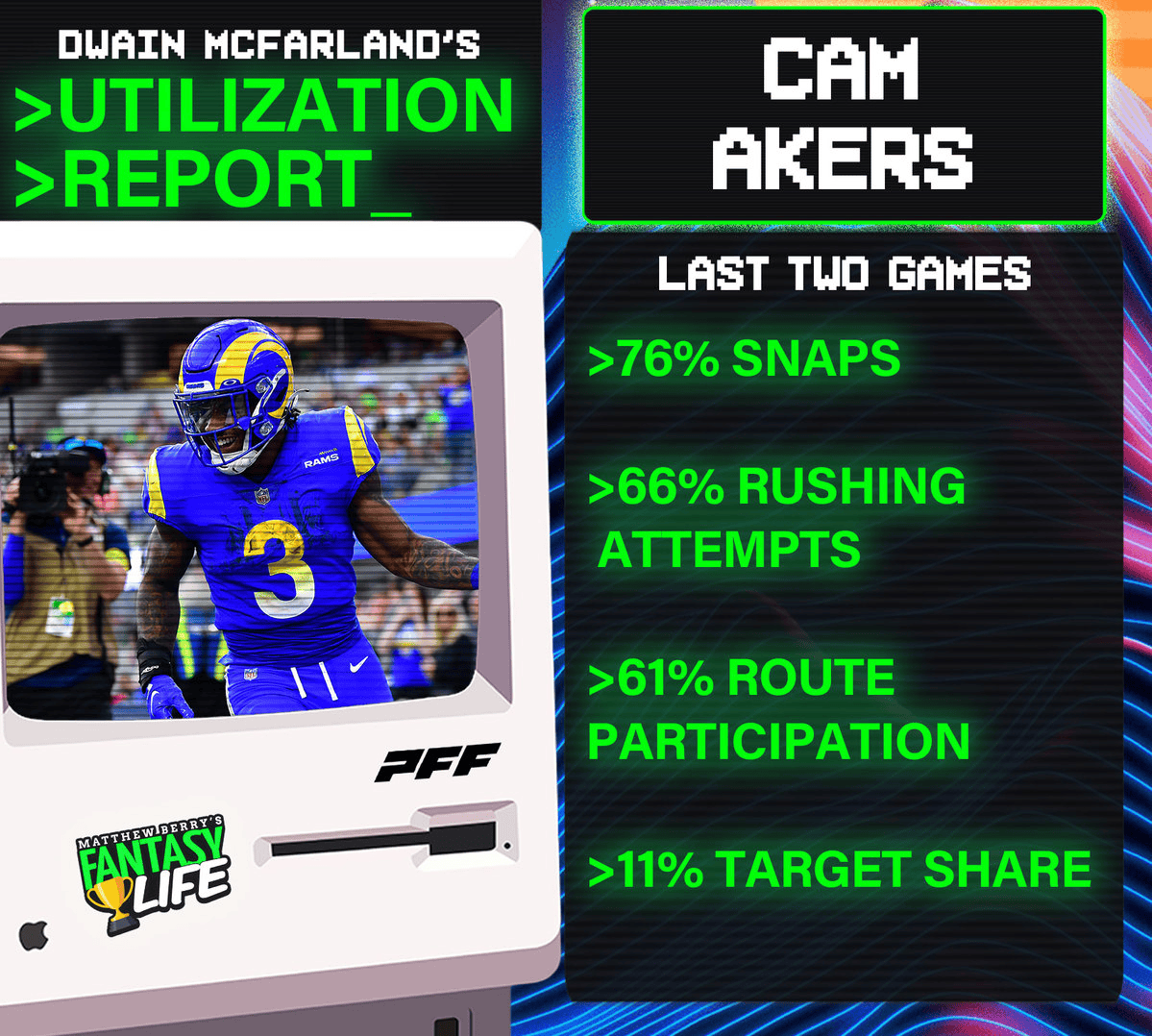 With the Rams hurting for passing targets, they are getting their RBs into routes on early downs. Additionally, Akers continues to dominate the short-yardage situations (88%) that have led to high-leverage touches near the goal line. The third-year back has five rushing TDs on carries inside the five-yard line over the last four weeks.