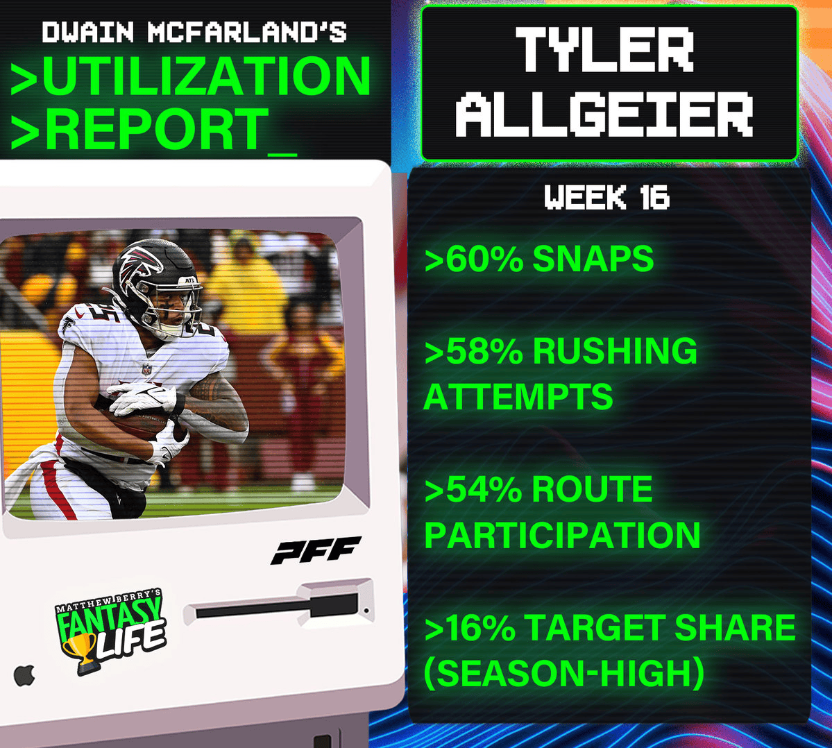 Allgeier leads the Falconsā backfield in snaps (54%) and rushing attempts (49%) over the last two games. In Week 16, he registered a season-high 23 opportunities with 18 rushing attempts and five targets.