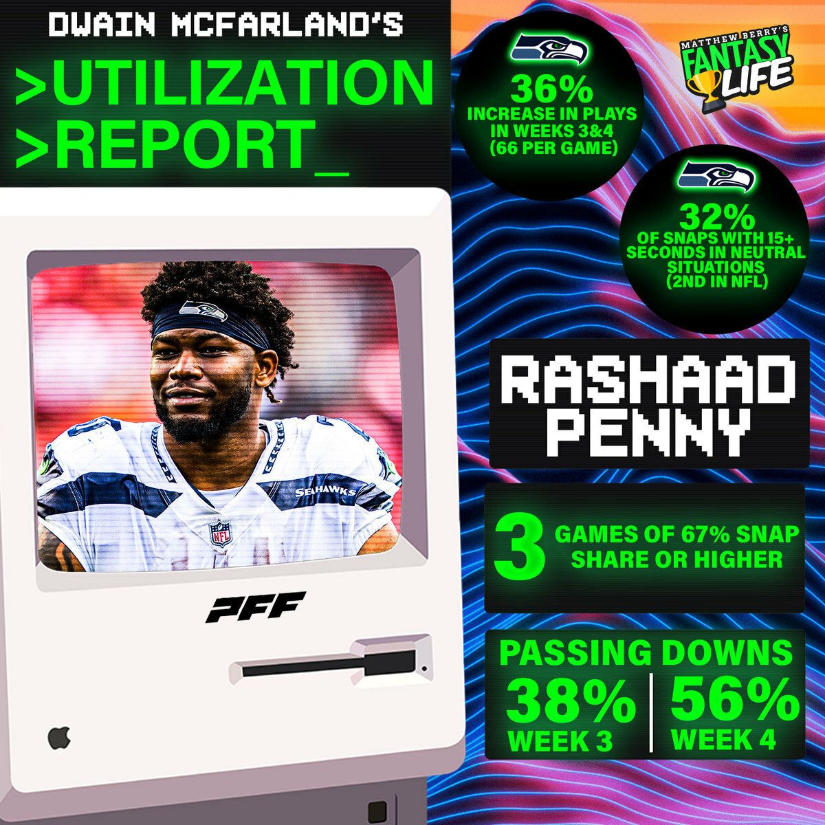 Kenneth Walker III remains a threat to push for work as the season progresses, but right now Penny is riding high along with the rest of the Seahawksā offense in their new up-tempo attack that is averaging 66 regulation plays per game over the last two weeks.