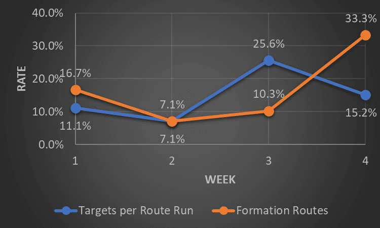 Singletaryās 20.8% TPRR over the last two weeks isnāt earth-shattering. He didnāt turn into Austin Ekeler. However, his formation route rate (routes run from the perimeter or slot) indicates otherwise. Singletaryās 15 snaps out wide or from the interior are more than Ekelerās during the same time frame.