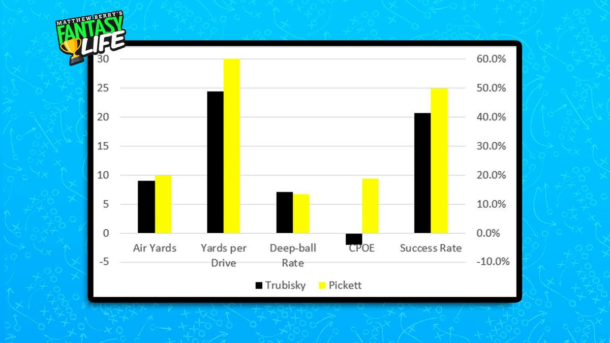We got three full weeks of Mitch Trubisky. After Week 3, he was bottom-10 in nearly every passing stat. The Steelers were dead last in yards per drive. But Pickett turned the offense around in two quarters.