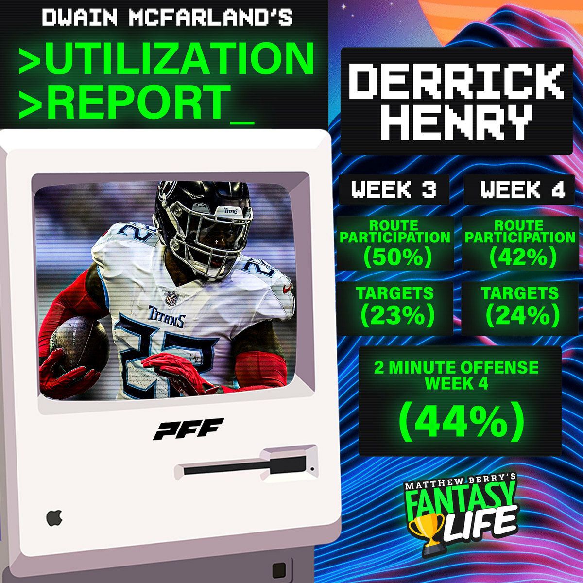 Henry has 23% and 24% target shares in the last two games, with three targets coming on screens (one was called back). The veteran back also picked up 44% of the two-minute offense in Week 4.Ā