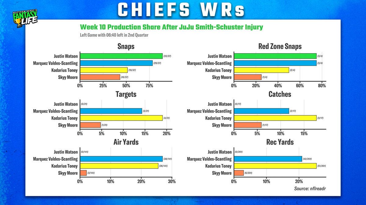 JuJu Smith-Schuster took a big hit in the 2nd quarter and was ruled out for the rest of the day. In addition, Mecole Hardman was ruled out prior to the game, setting the stage for Toney's big performance.Ā