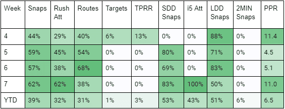 Allgeier quietly expanded his workload in Week 7 with a season-high 62% of Atlantaās rushing attempts. He also led the team in short-down-distance (SDD) work over the last three games, which correlates with touches near the goalline and TDs.