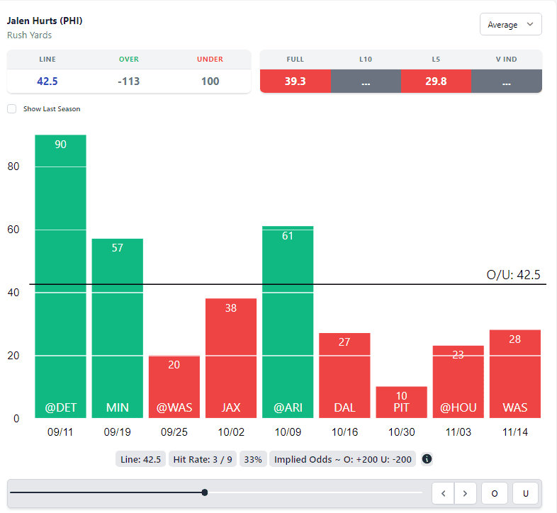 Betting against Hurts is always a scary proposition, but the Eagles simply haven’t needed to lean on their QB for late-game production consistently. It’s an odd situation to navigate, but with Hurts’ recent performance, this rushing line shouldn't be above 40.