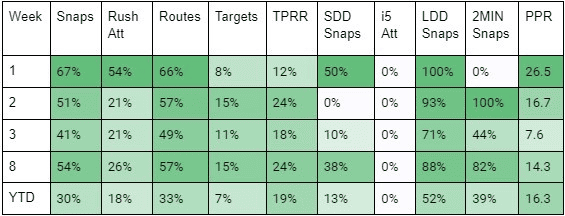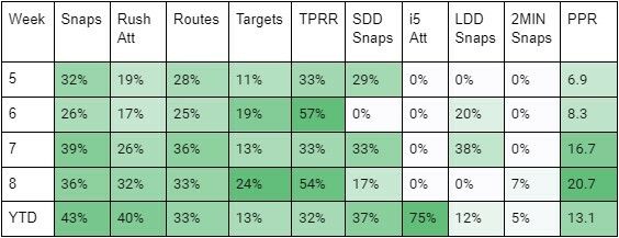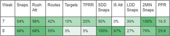 The last time Etienne rushed for under 77 rushing yards was in Week 5, in a game where Robinson accounted for 41% of the snaps, 43% of the rushing attempts, and 57% of the short-yardage snaps(SDD). Since then, Etienneās rushing totals have skyrocketed to 86 yards in Week 6, 114 yards in Week 7, and an absolutely massive 156-yard performance in Week 8.