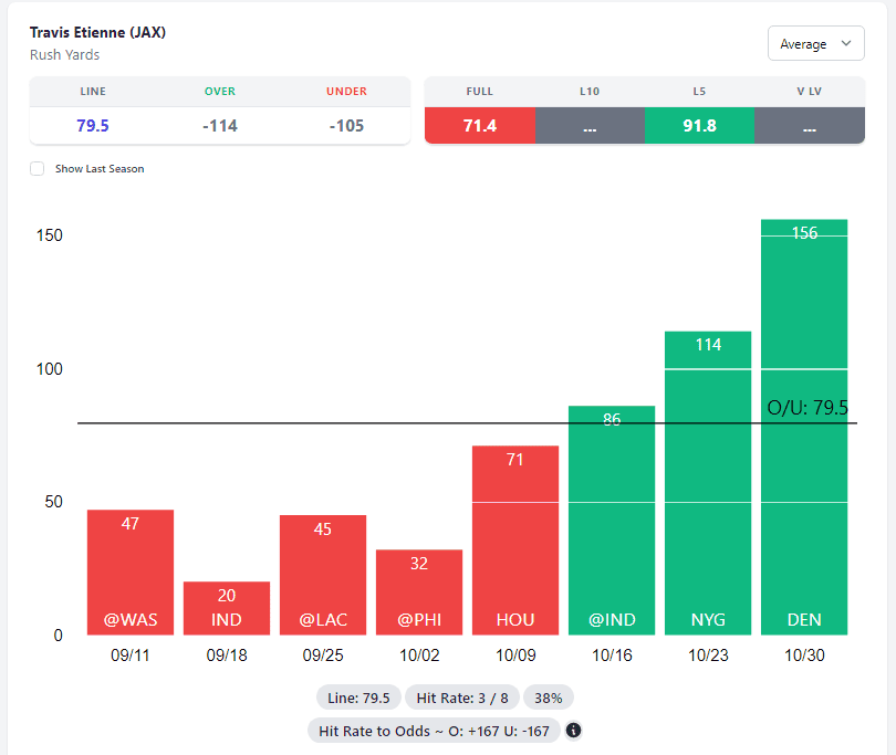 In Week 8, Etienne had an incredible utilization profile, notching 78% of the team's snaps and 73% of the rushing attempts while completely taking over both the short-yardage snaps(SDD)Ā and all of the rushing attempts inside of the 5-yard line. Today, weāre targeting a rushing prop, but as an added note, Ettienne also ran 59% of the Jaguarsā routes in Week 9.Ā