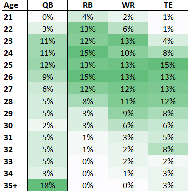 Percentage of top-12 fantasy producers by age over the last 10 years (PPR per game ranks, minimum 8 games)