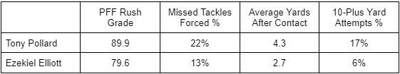 Pollard and Elliott split the rushing workload evenly, including the work inside the five-yard line. Elliott could regain the lead in those two areas as his knee gets stronger, but Pollard has outperformed Zeke in every efficiency metric.