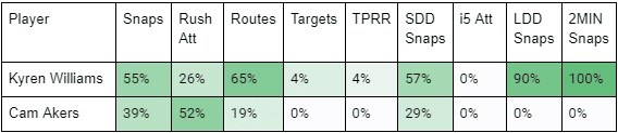 Thanks to Henderson's lack of playing time on Sunday, we have a viable data point to help us understand how the backfield might get divided. In Week 11, Kyren Williams led the way, playing 55% of snaps and dominating passing downs. Cam Akers was the primary rusher, handling 52% of the rushing attempts.