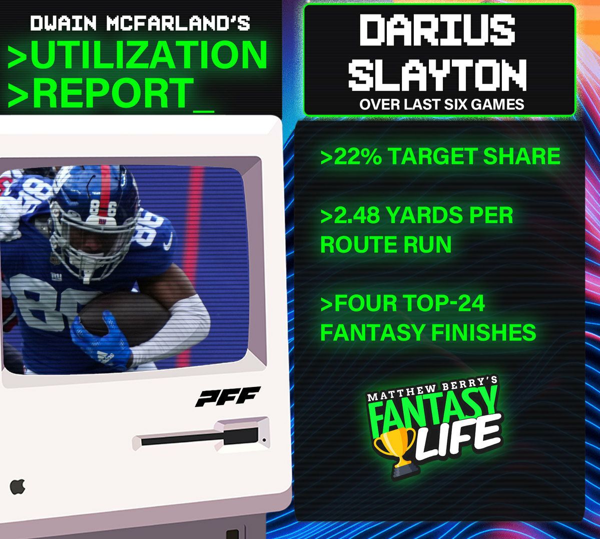 With WanāDale Robinson (knee) out for the season, the competition for targets in the Giants' offense is meager. Last weekend, Slayton posted a season-high in route participation (87%) and slot routes (48%).