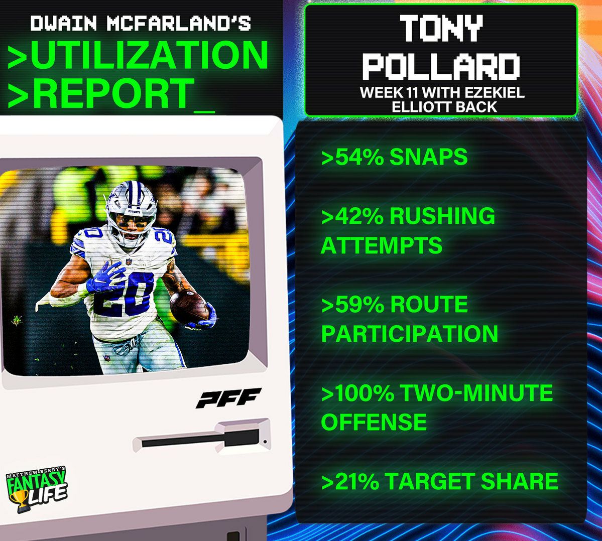Ezekiel Elliott returned to the lineup in Week 11 against the Vikings, which led to a rotation. However, an important development occurred, with Pollard posting a 59% route participation and gobbling up 100% of the two-minute offense.