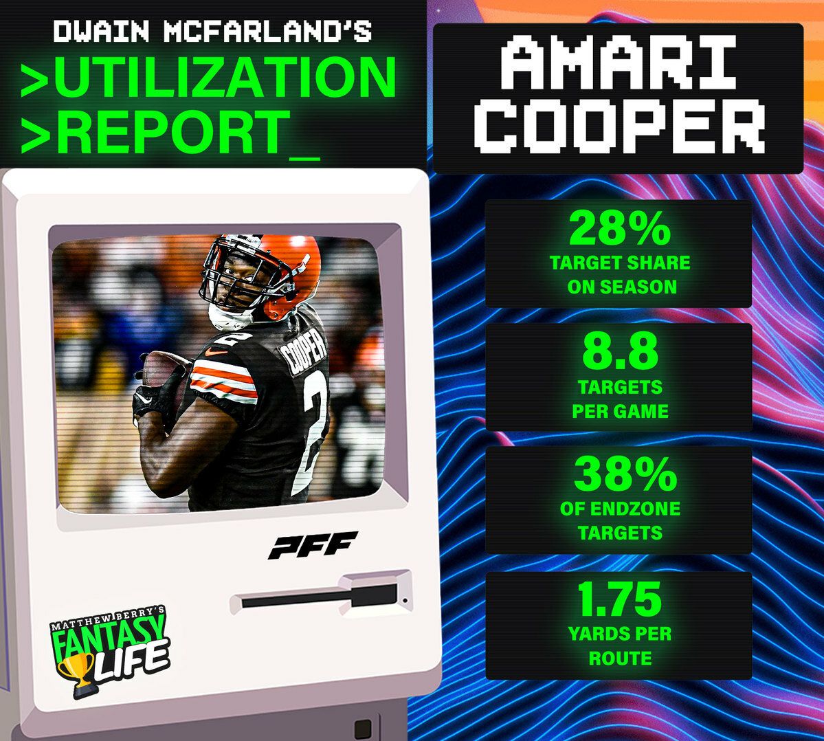 Cooper has 11 or more targets in three out of the last four games. He saw 12 against the Patriotsā man-heavy unit in Week 6 but was only able to corral four receptions.Ā The veteranās 28% target share is seven percentage points above his career-high mark. He is averaging 8.8 targets per game, which also tops his previous career-high (8.0).