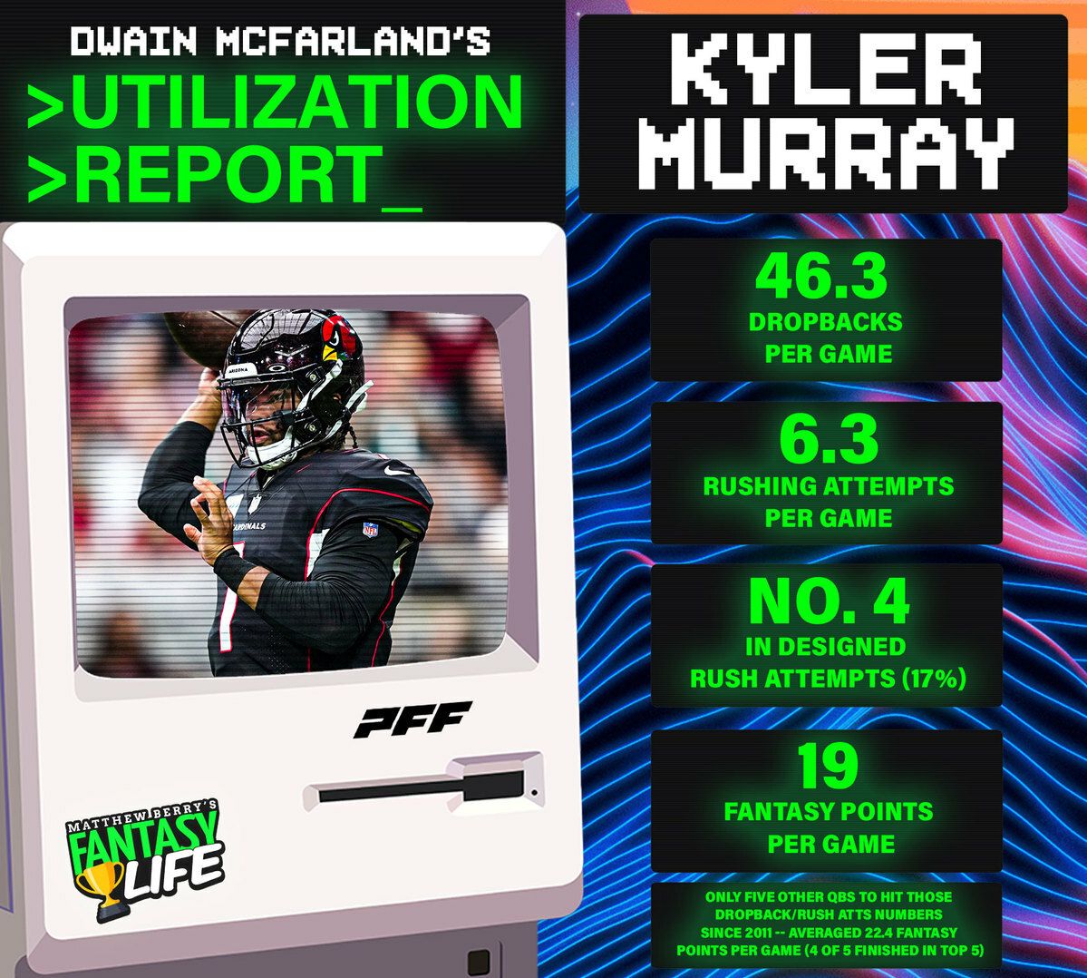 Murray is averaging 46.3 dropbacks and 6.3 rushing attempts per game, which puts him in elite historical company. Since 2011, only five QBs have hit those thresholds (minimum 12 games), and they averaged 22.4 fantasy points per game. Three registered 23.5-plus points per game, and only one didnāt register a top-5 finish in points per game (Robert Griffin III in 2013).