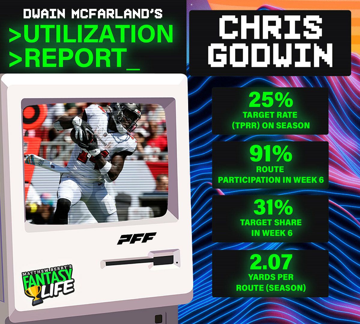 Godwin is due for an eruption game. He registered a season-high 91% route participation along with a 31% target share in Week 6.