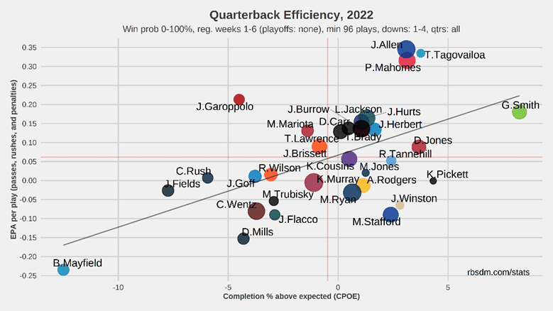Smith is fourth in adjusted completion percentage on passes of 2.5 seconds or less, according to PFF. Heās generated more passing yards off play-action than Patrick Mahomes. Josh Allen and Smith have the same number of touchdowns off deep throws. Smithās even thrived in pressure situations, with the fifth-highest EPA per dropback under duress.