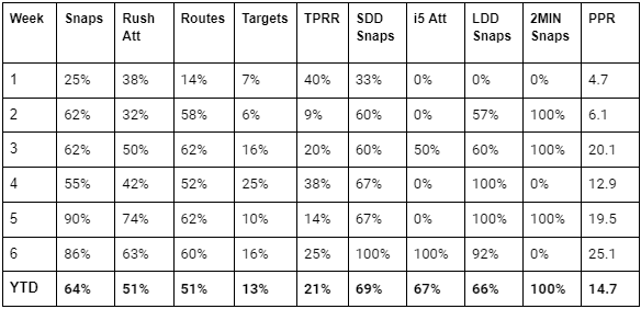 The dynamic rookie re-emerged from injury in Week 6 and made a big impact on the Giants offense despite a low snap count of just 23%.