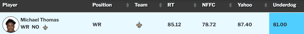 The latter is, of course, Michael Thomas and he might be the biggest mystery of them all. The market has reacted accordingly, with Thomas falling all the way into the 80s in most Underdog drafts: