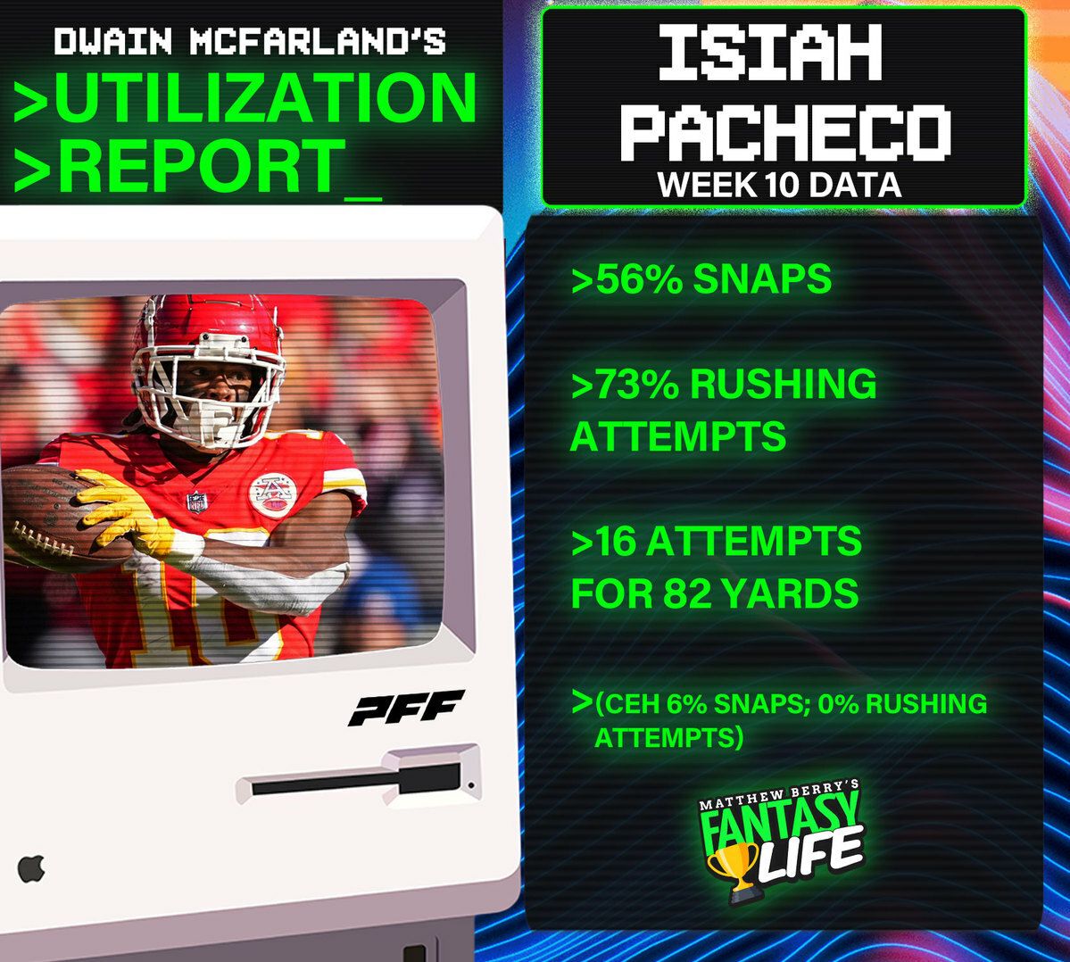 That all changed in Week 10, with Pacheco taking control of the Kansas City backfield, despite a fumble.
