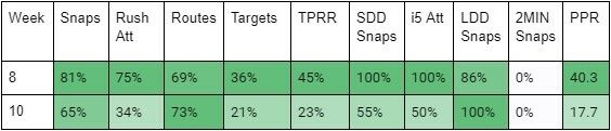 The silver lining is that he continues to run a route on nearly every passing play and has drawn a target on just over 25% of his routes this season. That usage is very encouraging and points to better performances in the near future.Ā