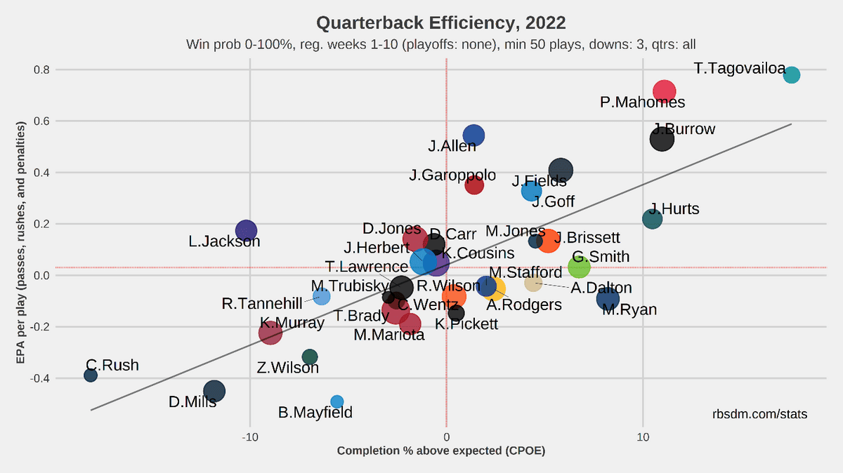 Thereās Kirk. Smack dab in the middle. In obvious passing situations, heās 15th in EPA per play with a 45.3% success rate. Heās 17th in efficiency across all downs, and the offense is 20th in yards per drive. So, at worst, itās a mediocre passing game. But the Cowboysā defense brings additional concern.