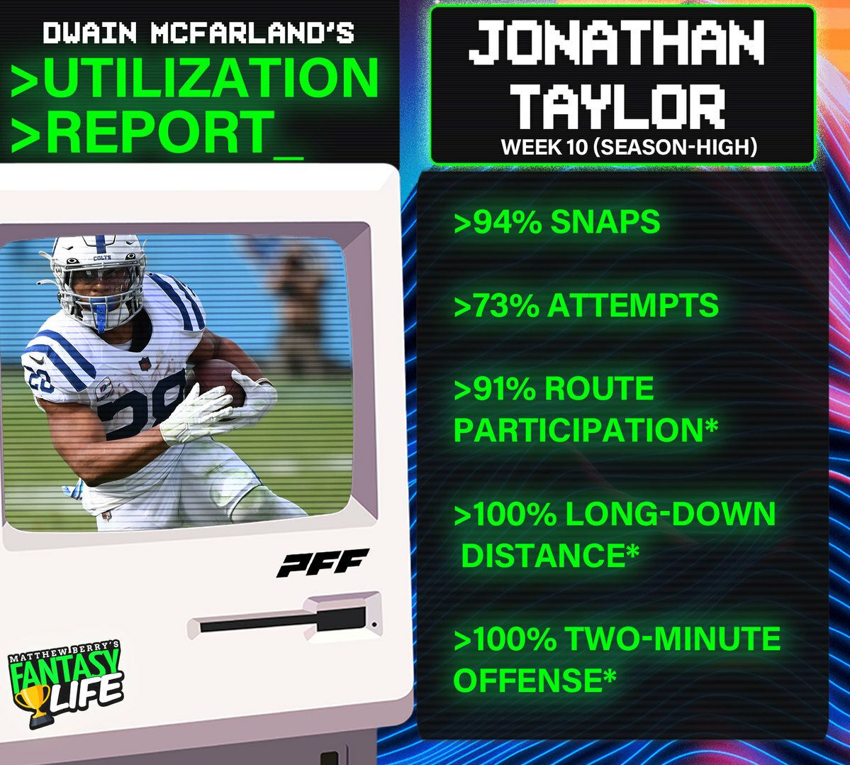 TaylorĀ looked healthy, delivering 147 yards and a TD on 22 rushing attempts in his return to the lineup.Ā Yet, the bigger news is his takeover of all the passing-down work, with Nyheim Hines traded to the Bills.