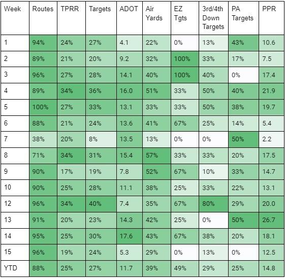 Moore registered a 30%-plus target share in two of Sam Darnold’s first three starts. In a passing offense as bad as the Panthers’, dominating targets is key, and Moore’s fantasy finishes echo that sentiment. In games with a 30%-plus target share, he averages 18.5 points.