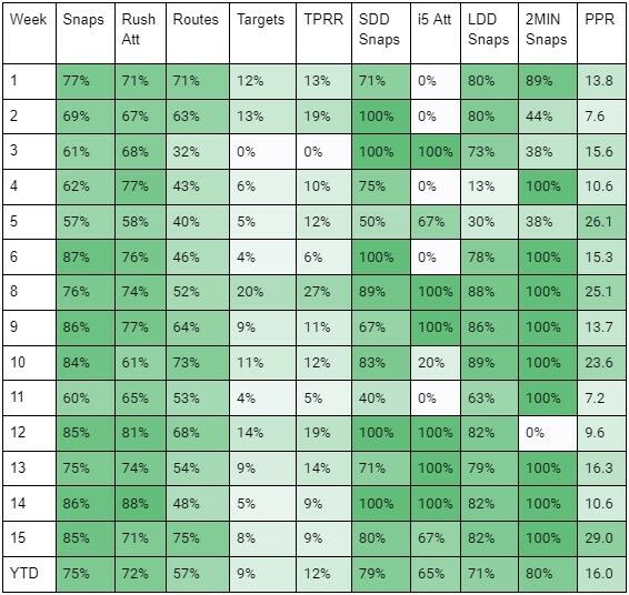 Cook had a rough stretch of games from Week 11 to 14, but his underlying utilization remained strong. In Week 15, he got things going again with the No. 2 RB fantasy output of 29 points.