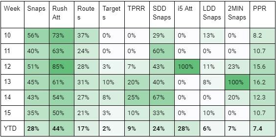 The Rutgers product remains the primary early-down option, averaging 15.8 rushing attempts per game since Week 10.