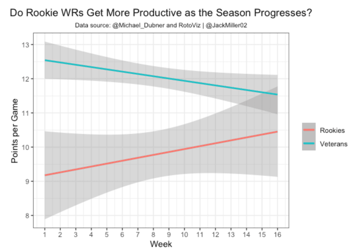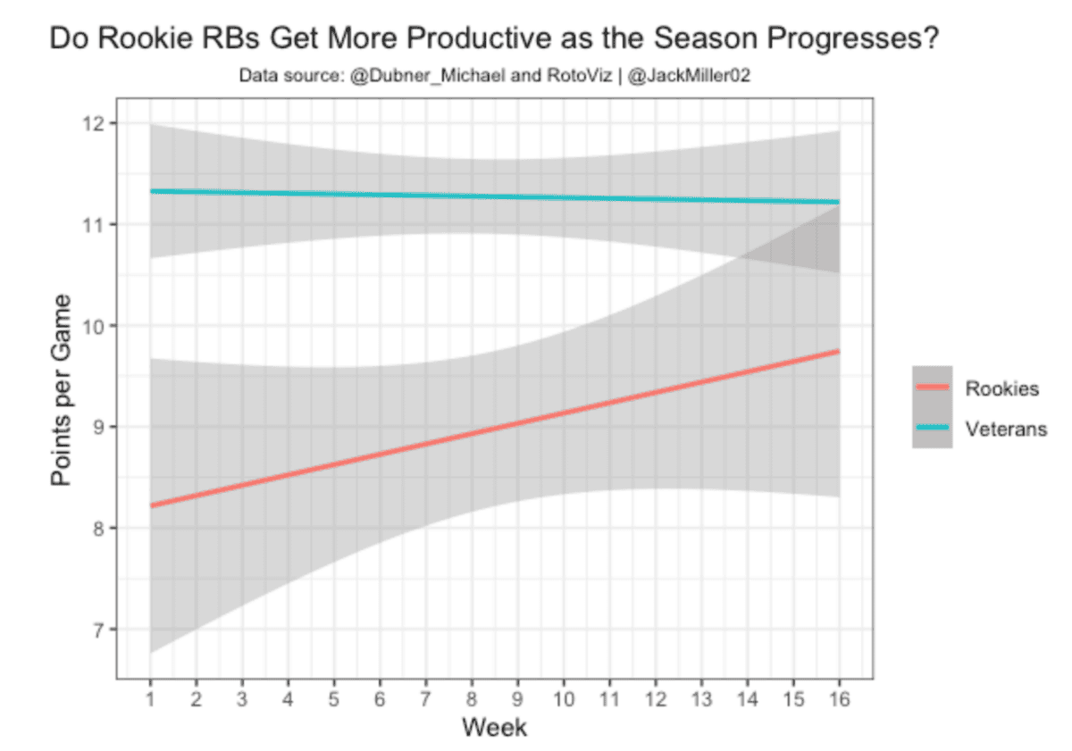 For rookie RBs, we can see from Rotoviz that their production increases as the season goes along and peaks in the playoffs: