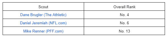 There is a chance one of the top QBs will fall to the Titans at pick 11, or they will make a trade to move up. With Tannehill entering his age-35 season, this would make a lot of sense, but in this scenario, we will assume the top options are gone based on the latest consensus big boards.