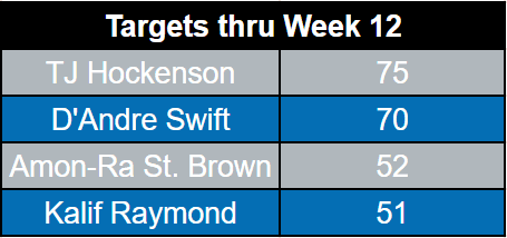 St. Brown was third in targets in Detroit behind RB DāAndre Swift and TE TJ Hockenson from Weeks 1 through 12: