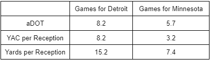 Although I expect his production to improve, it is worth noting that his career averages in these categories sit in between his Detroit and Minnesota numbers for this year. This suggests we shouldnāt expect a total return to what he was doing over the first half of the season, particularly in yards after the catch.