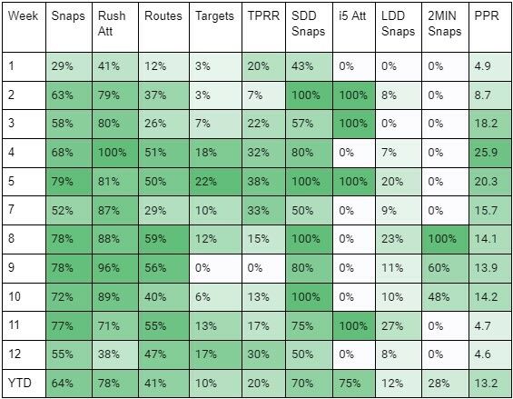 Pierce has overcome trailing game scripts all season despite not serving as the passing-down back. However, that combination has caught up with him over the last two games, posting back-to-back season lows in rushing attempts with ten and five, respectively.